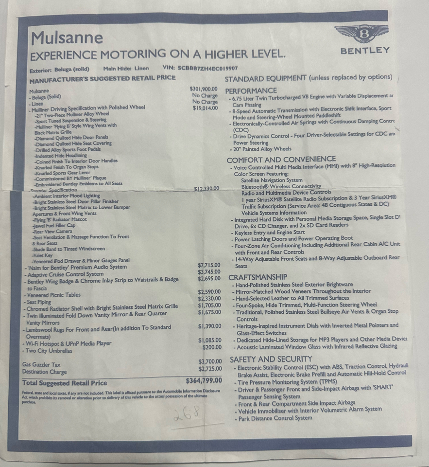 Clean CARFAX. 2014 Bentley Mulsanne Mulsanne Beluga RWD ZF 8-Speed Automatic 6.75L V8 SEFI OHV Twin Turbocharged Original MSRP $ 356164, Linen w/Power Heated Front Seats, 21" 2-Piece 5-Spoke Polished Alloy Wheels, 3-D Retractable Flying B Radiator Mascot, ABS brakes, Alloy wheels, Ambient Interior Mood Lighting, Bentley Jewel Fuel Filler Cap, Bright Stainless Steel Door Pillar Finisher, Bright Stainless Steel Matrix to Lower Bumper Apertures & Front Wing Vents, Compass, Drilled Alloy Accelerator & Brake Pedals, DVD-Audio, Electronic Stability Control, Front Bucket Seats, Front Center Armrest, Front dual zone A/C, Heated door mirrors, Heated front seats, Heated rear seats, Illuminated entry, iPod Interface & Leads w/Hand Stitched Leather Storage Case, Low tire pressure warning, Mulliner Driving Specification (Polished Wheel), NAIM Premium Audio System, Navigation System, Power Heated Front Seats, Power moonroof, Power passenger seat, Premiere Specification, Rear dual zone A/C, Rear-View Camera, Remote keyless entry, Seat Ventilation & Massage Function to Front & Rear Seats, Shade Band to Windscreen, Split folding rear seat, Sport-Tuned Suspension & Steering, Traction control, Valet Key, Veneer iPod Drawer & Minor Gauges Panel, Veneered Picnic Tables to Rear of Front Seats. Welcome to High-line Motor Group! Celebrating 30 years of automotive sales and service to Massachusetts and the USA! We have something for everyone! Whether the discerning enthusiast, or those of you, looking for a GREAT vehicle at a superb price. We take pride in our reputation of well maintained, serviced and specialty vehicles. With thousands of satisfied and repeat customers, you can rest assured, we will provide you with a relaxed and exceptional experience from the moment you contact us. BBB A+ rated and a proud supporter of our local communities. Give us a try, and “experience the difference.” Reviews: * Impeccable interior; modern electronics and amenities; prodigious thrust; smooth and silent ride; feature-rich content. Source: Edmunds