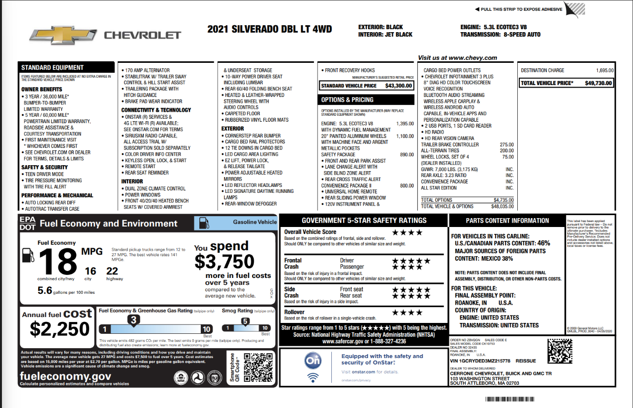 Clean CARFAX. 2021 Chevrolet Silverado 1500 LT Black 4WD 8-Speed Automatic EcoTec3 5.3L V8 8-Speed Automatic, 4WD, Black Cloth, 10-Way Power Driver Seat w/Lumbar, 12-Volt Rear Auxiliary Power Outlet, 120-Volt Bed Mounted Power Outlet, 120-Volt Instrument Panel Power Outlet, 2 USB Ports, 2 USB Ports (First Row), 4.2" Diagonal Color Display Driver Info Center, 4G LTE Wi-Fi Hot Spot Capable, All-Star Edition, Auto-Locking Rear Differential, Bluetooth® For Phone, Chevrolet Connected Access Capable, Chrome Grille, Chrome Mirror Caps, Color-Keyed Carpeting Floor Covering, Compass, Convenience Package, Convenience Package II, Deep-Tinted Glass, Dual-Zone Automatic Climate Control, Electric Rear-Window Defogger, Electrical Lock Control Steering Column, Electronic Cruise Control, EZ Lift Power Lock & Release Tailgate, Front Frame-Mounted Black Recovery Hooks, Front Rubberized Vinyl Floor Mats, HD Radio, HD Rear Vision Camera, Heated Driver & Front Outboard Passenger Seats, Heated Steering Wheel, Hitch Guidance, Keyless Open & Start, Lane Change Alert w/Side Blind Zone Alert, Leather Wrapped Steering Wheel, LED Cargo Area Lighting, Manual Tilt/Telescoping Steering Column, OnStar & Chevrolet Connected Services Capable, Perimeter Lighting, Power Door Locks, Power Front Windows w/Driver Express Up/Down, Power Front Windows w/Passenger Express Down, Power Rear Windows w/Express Down, Power Sliding Rear Window w/Rear Defogger, Preferred Equipment Group 1LT, Radio: Chevrolet Infotainment 3 Plus System, Rear 60/40 Folding Bench Seat (Folds Up), Rear Cross Traffic Alert, Rear Dual USB Charging-Only Ports, Rear Rubberized-Vinyl Floor Mats, Rear Vision Camera, Remote Vehicle Starter System, Safety Package, SiriusXM Radio, SiriusXM w/360L, Standard Tailgate, Steering Wheel Audio Controls, Theft Deterrent System (Unauthorized Entry), Trailering Package, Ultrasonic Front & Rear Park Assist, Universal Home Remote, Wireless Phone Projection. Welcome to High-line Motor Group! Celebrating 30 years of automotive sales and service to Massachusetts and the USA! We have something for everyone! Whether the discerning enthusiast, or those of you, looking for a GREAT vehicle at a superb price. We take pride in our reputation of well maintained, serviced and specialty vehicles. With thousands of satisfied and repeat customers, you can rest assured, we will provide you with a relaxed and exceptional experience from the moment you contact us. BBB A+ rated and a proud supporter of our local communities. Give us a try, and “experience the difference.” Recent Arrival!