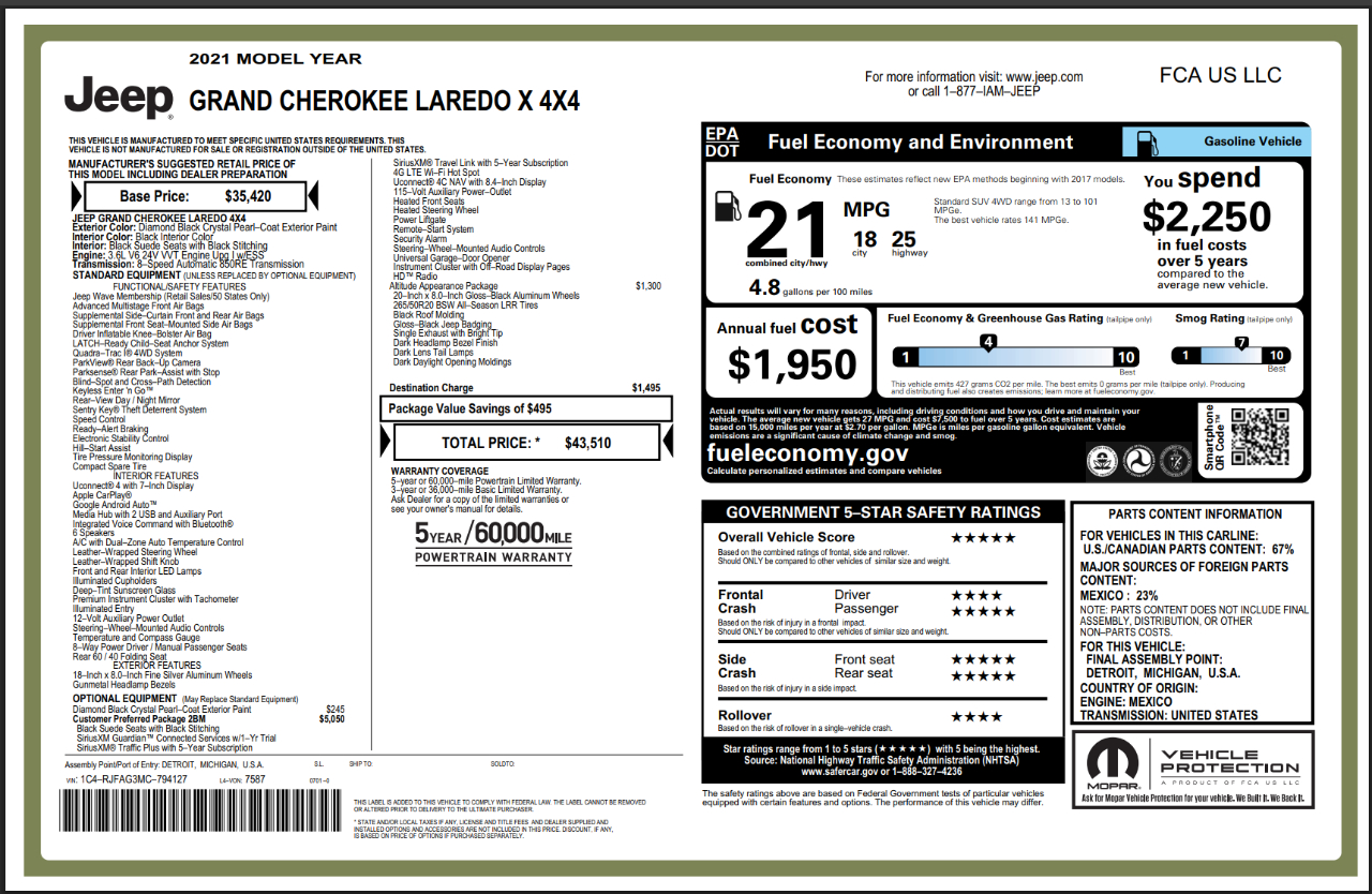 CARFAX One-Owner. Clean CARFAX. 2021 Jeep Grand Cherokee Laredo X Diamond Black Crystal Pearlcoat 4WD 8-Speed Automatic 3.6L V6 24V VVT 4WD, 4G LTE Wi-Fi Hot Spot, 5-Year SiriusXM Traffic Service, 5-Year SiriusXM Travel Link Service, 8.4" Touchscreen Display, Altitude Appearance Package, Altitude Grille, Apple CarPlay, Black Roof Molding, Black Suede Seats w/Black Stitching, Body Color Claddings, Body Color Fascia, Body Color Shark Fin Antenna, Bridgestone Brand Tires, Dark Day Light Opening Moldings, Dark Headlamp Bezel Finish, Dark Lens Taillamps, Delete Laredo Badge, Front Accent/Body Color Fascia, Gloss Black Jeep Badging, Gloss Black Rear Fascia Applique, Google Android Auto, GPS Antenna Input, GPS Navigation, HD Radio, Heated Front Seats, Heated Steering Wheel, Instrument Cluster w/Off-Road Disp. Pages, Integrated Voice Command w/Bluetooth, Power Liftgate, Quick Order Package 2BM Laredo X (DISC), Radio: Uconnect 4C Nav w/8.4" Display, Rear Accent/Body Color Fascia, Rear Fascia Black Molded in Color Step Pad, Remote Start System, Security Alarm, Single Exhaust w/Bright Tip, Steering Wheel Mounted Audio Controls, Universal Garage Door Opener, Wheels: 20" x 8.0" Gloss Black Aluminum. Welcome to High-line Motor Group! Celebrating 30 years of automotive sales and service to Massachusetts and the USA! We have something for everyone! Whether the discerning enthusiast, or those of you, looking for a GREAT vehicle at a superb price. We take pride in our reputation of well maintained, serviced and specialty vehicles. With thousands of satisfied and repeat customers, you can rest assured, we will provide you with a relaxed and exceptional experience from the moment you contact us. BBB A+ rated and a proud supporter of our local communities. Give us a try, and “experience the difference.” Recent Arrival! Odometer is 4996 miles below market average!