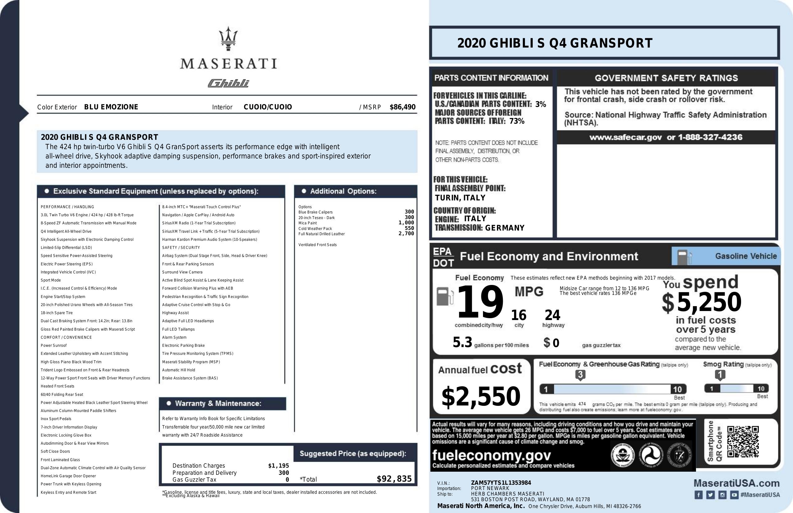 Priced below KBB Fair Purchase Price! 2020 Maserati Ghibli S Q4 GranSport Blu Emozione Mica AWD ZF 8-Speed Automatic 3.0L V6 Climate Package, Heated Rear Seats, Heated Windshield Washer Nozzles, Power Rear Sunblind, Wheels: 20" Gloss Black Urano. Welcome to High-line Motor Group! Celebrating 30 years of automotive sales and service to Massachusetts and the USA! We have something for everyone! Whether the discerning enthusiast, or those of you, looking for a GREAT vehicle at a superb price. We take pride in our reputation of well maintained, serviced and specialty vehicles. With thousands of satisfied and repeat customers, you can rest assured, we will provide you with a relaxed and exceptional experience from the moment you contact us. BBB A+ rated and a proud supporter of our local communities. Give us a try, and “experience the difference.”ASK ABOUT OUR CERTIFIED VEHICLE PROGRAM. Do not hesitate to contact James at 1-866-231-2457 to make your purchase arrangements! And remember we service every make and model of every vehicle that we sell. Visit us today and EXPERIENCE THE DIFFERENCE! Buy from The High Line Group with CONFIDENCE. We are a 30 year family owned and operated business! We offer very competitive financing rates and terms for all credit levels along with long term extended power-train warranties. The Highline Group makes every attempt to make sure our listings are factual and accurate. Please give us a call if you have a question about any of our vehicles. For more information, photos, and to view our complete inventory visit us @ www.highlinemotorgroup.com to see more pictures of this vehicle or call us at 978-866-2176 today to schedule your test drive.