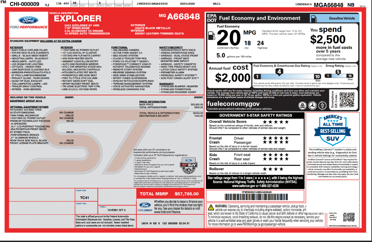 CARFAX One-Owner. 2021 Ford Explorer ST Black 4WD 10-Speed Automatic 3.0L EcoBoost V6 4WD, 10.1" LCD Capacitive Portrait Touchscreen, 110V/150W AC Power Outlet, 2 Additional Speakers, 360-Degree Camera w/Split View, Active Park Assist 2.0, Auto-Dimming Rearview Mirror (Interior), Equipment Group 401A, Evasive Steering Assist, Ford Co-Pilot360 Assist+, FordPass Connect, Forward Sensing System, Front Rain-Sensing Wipers, Hands-Free Foot-Activated Liftgate, Intelligent Adaptive Cruise Control, Leather Htd/Ventilated Sport Captain's Chairs, Memory Driver's Seat, Performance Front & Rear Brakes, Power Tilt/Telescoping Steering Column, Premium Technology Package, Radio: B&O Sound System by Bang & Olufsen, Reverse Brake Assist, Second Row Heated Seats, Sideview Mirrors w/Gloss Black Caps, Speed Sign Recognition, ST High Package, ST Street Pack, SYNC 3 Communications & Entertainment System, Third Row PowerFold (Folds Flat), Universal Garage Door Opener (UGDO), Voice-Activated Touchscreen Navigation System, Wheels: 21" Aluminum, Wireless Charging Pad. Welcome to High-line Motor Group! Celebrating 30 years of automotive sales and service to Massachusetts and the USA! We have something for everyone! Whether the discerning enthusiast, or those of you, looking for a GREAT vehicle at a superb price. We take pride in our reputation of well maintained, serviced and specialty vehicles. With thousands of satisfied and repeat customers, you can rest assured, we will provide you with a relaxed and exceptional experience from the moment you contact us. BBB A+ rated and a proud supporter of our local communities. Give us a try, and “experience the difference.” Recent Arrival!
