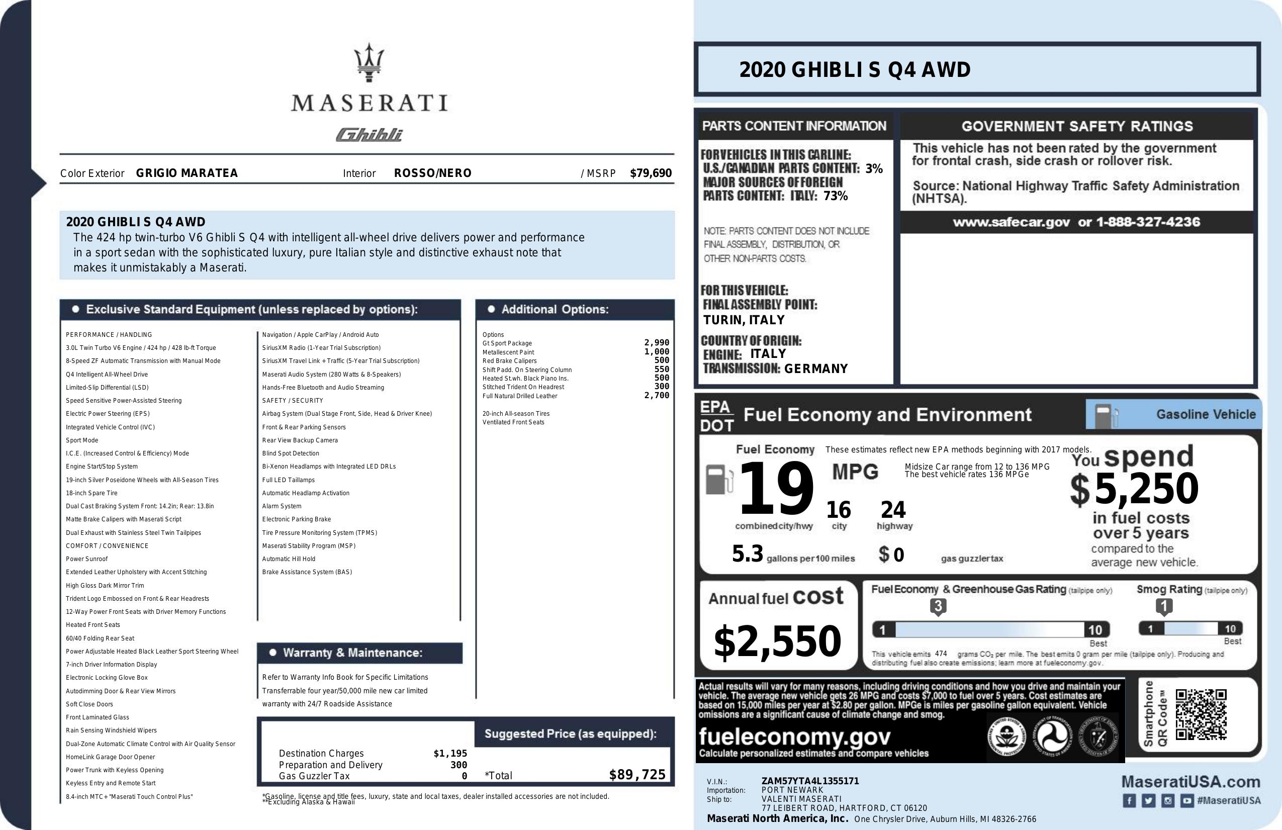 2020 Maserati Ghibli S Q4 Grigio Maratea Metallescent AWD ZF 8-Speed Automatic 3.0L V6 Welcome to High-line Motor Group! Celebrating 30 years of automotive sales and service to Massachusetts and the USA! We have something for everyone! Whether the discerning enthusiast, or those of you, looking for a GREAT vehicle at a superb price. We take pride in our reputation of well maintained, serviced and specialty vehicles. With thousands of satisfied and repeat customers, you can rest assured, we will provide you with a relaxed and exceptional experience from the moment you contact us. BBB A+ rated and a proud supporter of our local communities. Give us a try, and “experience the difference.” Recent Arrival!