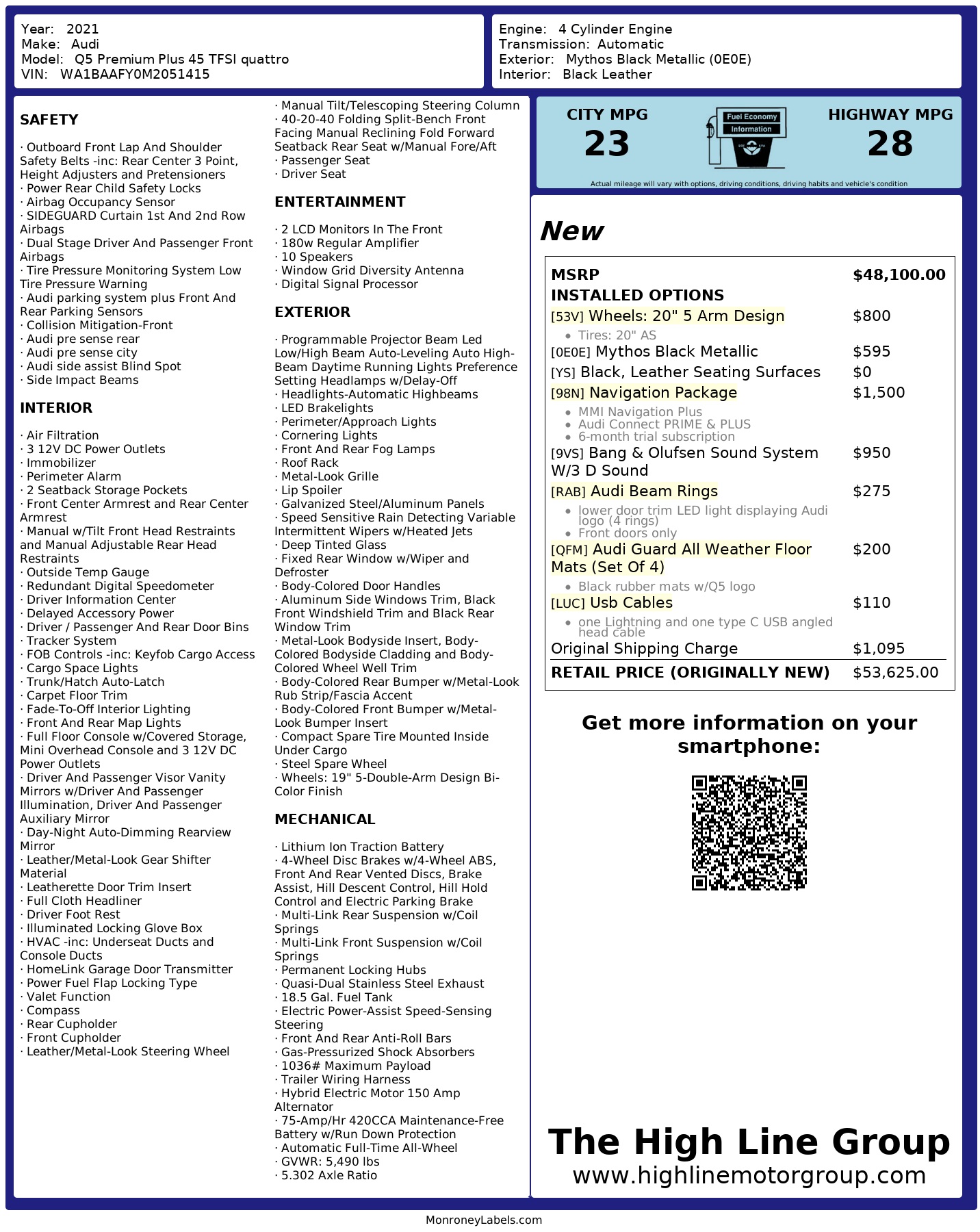 Clean CARFAX. 2021 Audi Q5 45 Premium Plus quattro Mythos Black Metallic quattro 7-Speed Automatic S tronic 2.0L Turbocharged Black w/Leather Seating Surfaces, Adaptive Cruise Control w/Traffic Jam Assist, Audi Active Lane Assist, Audi Advanced Key, Audi Connect PRIME & PLUS, Audi Phone Box, Audi Virtual Cockpit Plus, Auto-Dimming Power Folding Exterior Mirrors, Bang & Olufsen Sound System w/3D Sound, Convenience Package, Driver Seat Memory, Hands-On Detection Steering Wheel, Heated Steering Wheel, Leatherette Covered Center Console & Door Armrests, MMI Navigation Plus, Navigation Package, Panoramic Sunroof, Premium Plus Package, SiriusXM All Access Service, Top View Camera System, Wheels: 20" 5-Arm Design. Welcome to High-line Motor Group! Celebrating 30 years of automotive sales and service to Massachusetts and the USA! We have something for everyone! Whether the discerning enthusiast, or those of you, looking for a GREAT vehicle at a superb price. We take pride in our reputation of well maintained, serviced and specialty vehicles. With thousands of satisfied and repeat customers, you can rest assured, we will provide you with a relaxed and exceptional experience from the moment you contact us. BBB A+ rated and a proud supporter of our local communities. Give us a try, and “experience the difference.” Recent Arrival! 23/28 City/Highway MPG